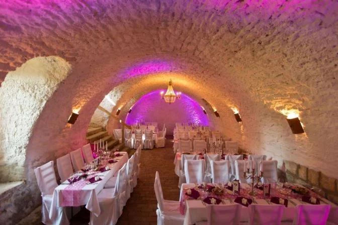 Über eine kurze Sandsteintreppe gelangt man zu dem Gewölbe, das weiß getüncht hell und freundlich direkt unterhalb der Terrasse liegt. Das Gewölbe ist in 3 Bereiche (Buffet, Tanz- und Sitzbereich) gegliedert.